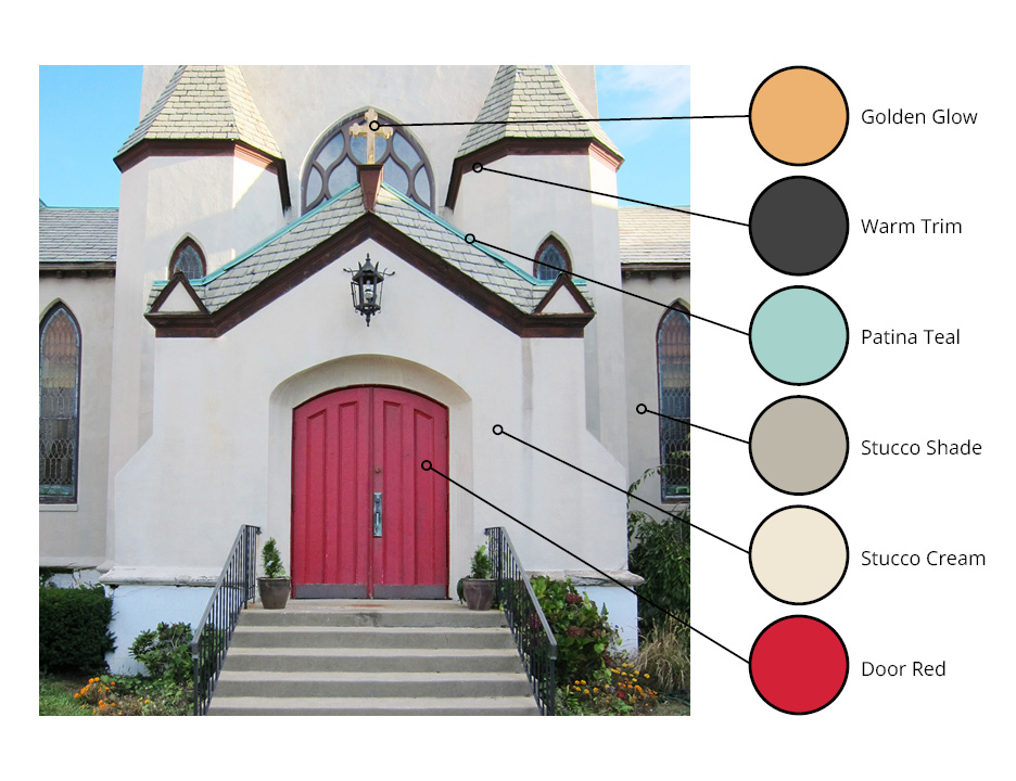 Even the colors tell our story. Door red. Golden glow. Stucco cream. Warm trim. Patina teal. Each one recalling what was lost, yet carrying forward what endures—faith, community, and the grace that holds us together.