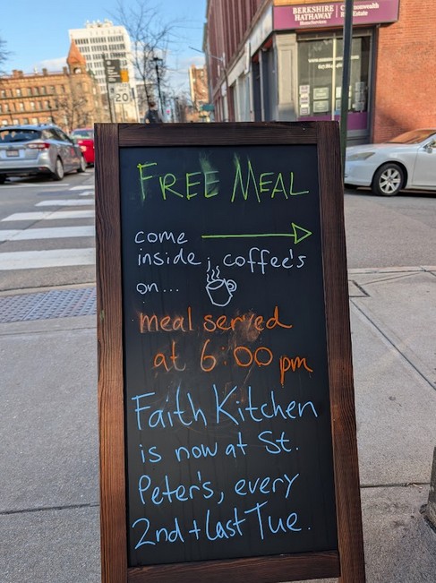 Faith Kitchen served its first meal at our new home—St. Peter’s Episcopal Church. We opened the doors at 5:30, shared soup and bread by 6, and by 6:30 the full meal was underway. Laughter, conversation, and good food filled the room.