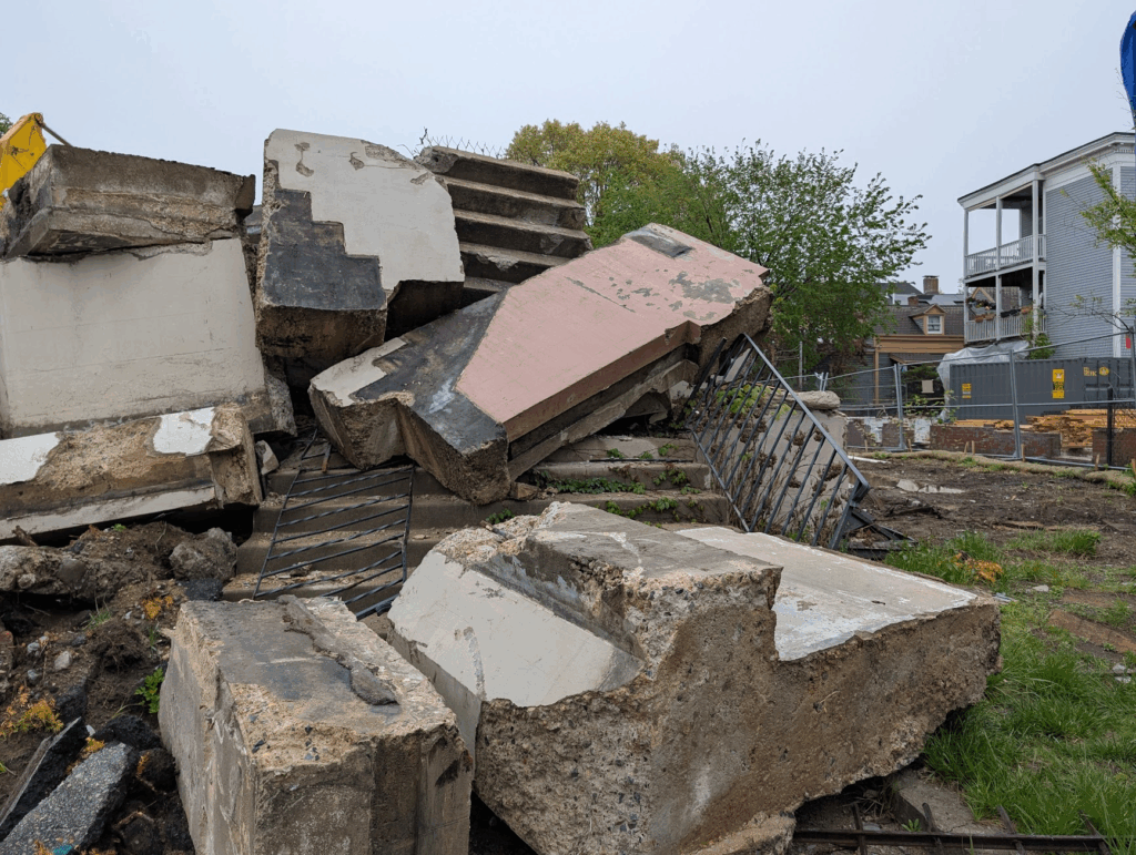 Demolition is now underway at the site. Over the next two months, the remaining structure will be carefully dismantled and removed from the property. Once the debris is cleared, the area will be filled in and transformed into a temporary green space with a newly planted grass lawn.