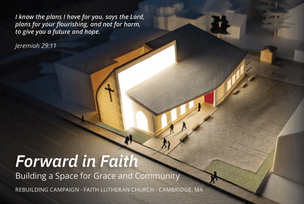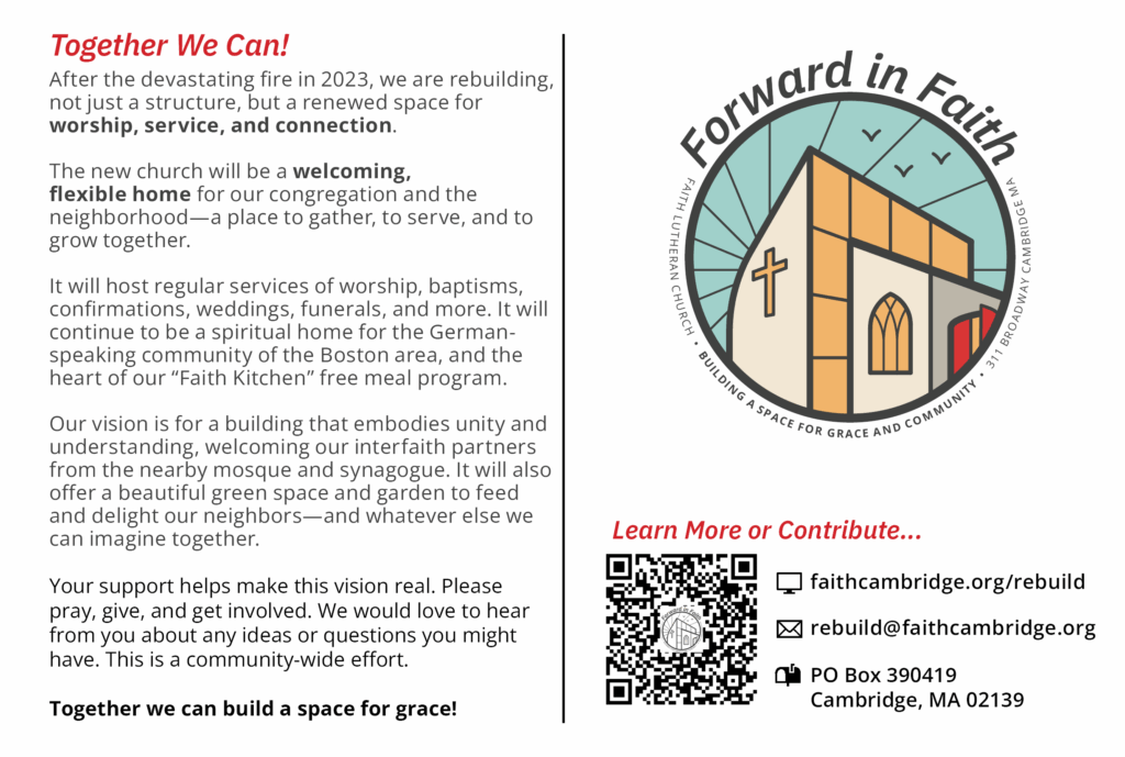 • Open House: On March 23, 2024 from 4:00-5:30 p.m. at 204 Prospect Street, The Islamic Society of Boston (ISB Cambridge) kindly offered us their space to discuss the future building of Faith Lutheran Church. Please join us for conversation, idea sharing, and information on how to stay up to date on the developments on our property!