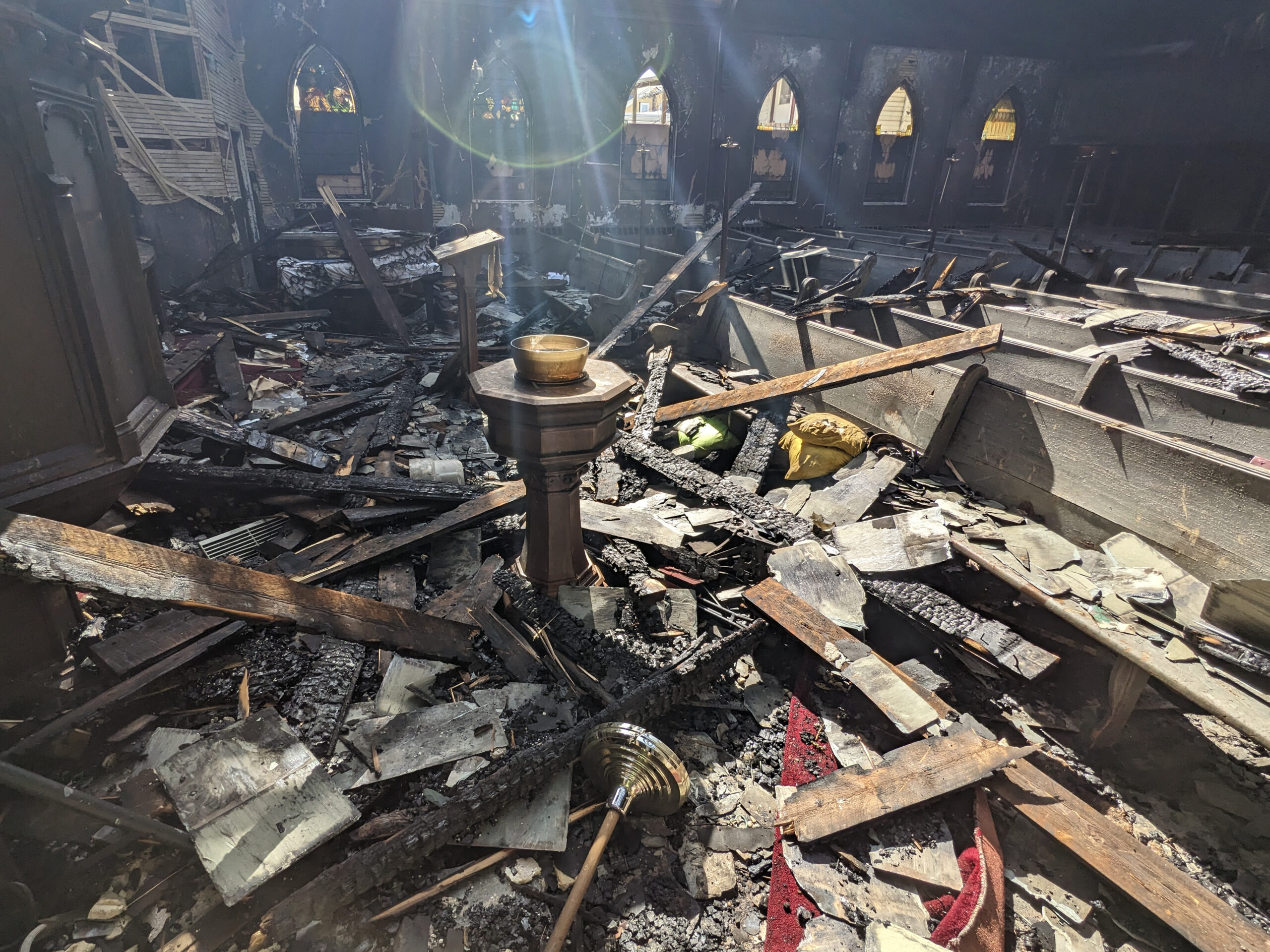 Numerous artifacts have been recovered from the rubble, and with hope and determination, they may one day find new homes in a rebuilt space. Among the items set aside are the copper finials, both the large and small crosses, a handful of stained glass windows, pieces of slate from the roof, the lectern, and the baptismal font. The bell remains inaccessible for now, but we hope to retrieve it safely during the final stages of demolition.