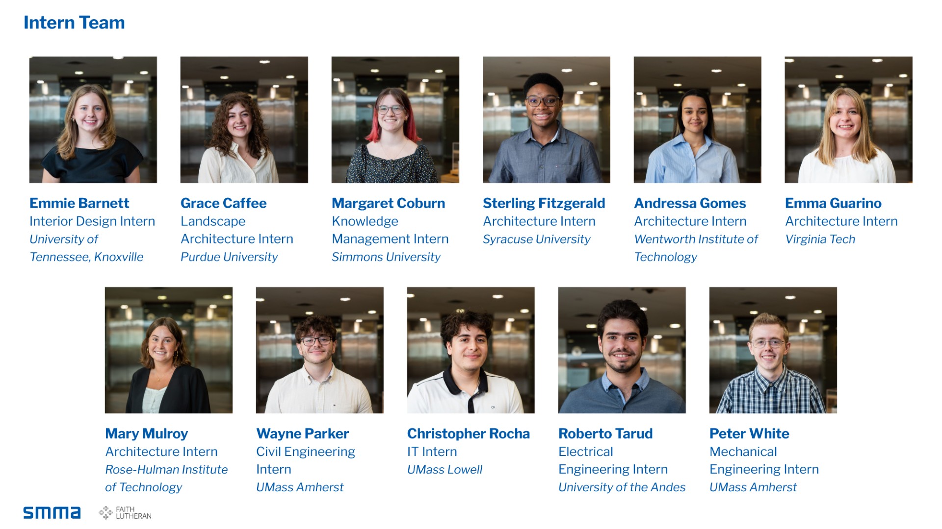 Each year, SMMA brings together an interdisciplinary cohort of designers and engineers from universities near and far. As part of their summer program, these interns tackle an independent real-world project, culminating in a design proposal and presentation.