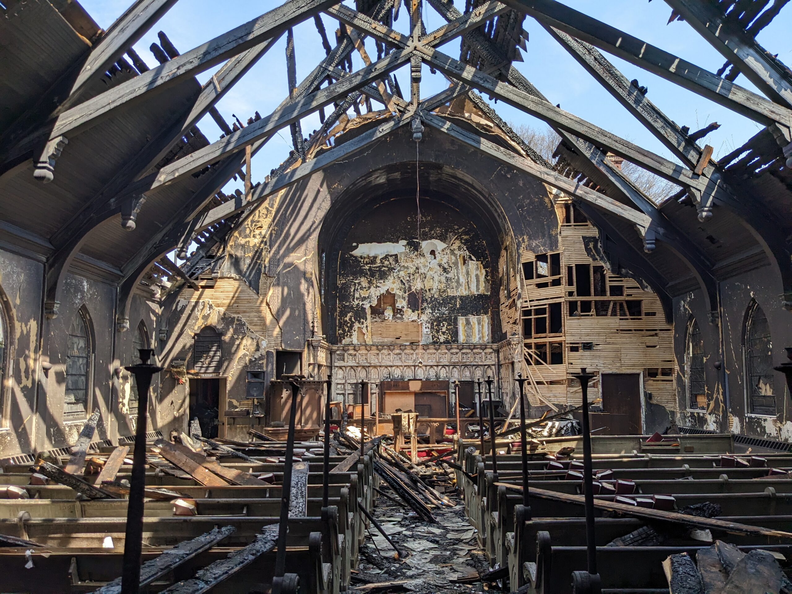On Easter Sunday last April we lost our beloved building at 311 Broadway to a 6-alarm fire, which we now know was caused by arson. Our congregation has found a temporary home at the north campus of Pentecostal Tabernacle at 77 Columbia Street, but our building has been sitting charred and empty for almost a year. Working with structural engineers we learned that the church structure is not stable enough to simply be restored, so, sadly, our 114-year old church will have to be fully demolished this spring.