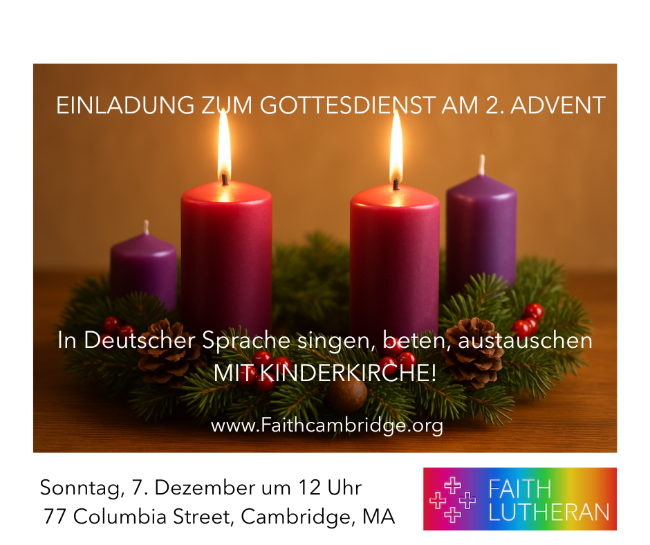 Our next German-language service will take place on Sunday, December 7, at 12:00 pm on the Second Sunday of Advent. The service will be entirely in German, one hour long, and include a sermon and a simultaneous bilingual Children’s Church (Kinderkirche), in which kids can explore the day’s themes and texts playfully in a safe and welcoming environment, regardless of German or English ability.