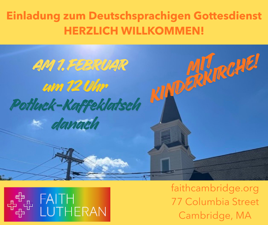 Our next German-language service will take place on Sunday, March 1 at 12 pm at 77 Columbia Street in Cambridge, MA.